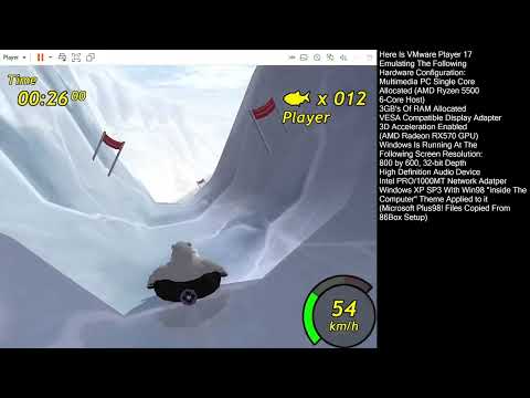 VMware Player 17 is virtualizing a x86 multimedia PC with a single core processor (AMD Ryzen 5 5500 6-Core Host with each core running at 4.2GHz), 3GB of RAM, and a VESA Compatible display with 3D Acceleration Enabled. Windows is running at the screen resolution of 800 by 600, 32-bit color depth. The VM also has a HD audio device, and an AMD PCnet NIC. Windows XP SP3 is installed with the Plus!98 “Inside My Computer” theme that was copied over from a Windows 98 installation.
