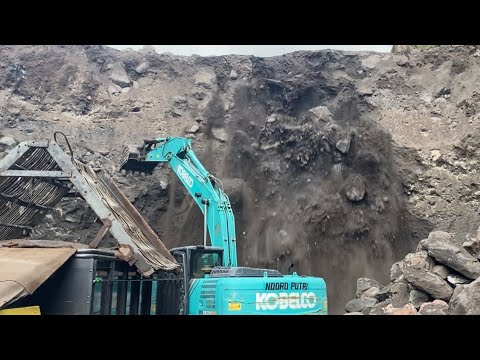 excavator working to tear down a cliff in a sand mine This time the heavy equipment still uses Kobelco SK200 This sand mining is very dizzying for operators, large rocks make the location less spacious#sandmining #excavator #bigstone #pc200