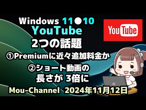 Windows 11●10●YouTube●2つの話題● ①Premiumに近々追加料金か●②ショート動画の長さが 3倍に